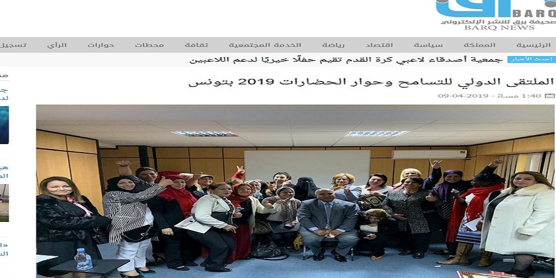 يونيو232019Destinationhttp://الملتقى الدولي للتسامح وحوار الحضارات 2019 بتونس Category: DestinationBy admin23 يونيو، 2019Leave a comment Author: admin Post navigationPreviousPrevious post:غداً 30 يونيو 2019 موعد انطلاق الملتقى الدولي لحوار الثقافات بمدينة الدار البيضاء برعاية رئيسة هيئة المرأة العالمية للتنمية و السلامNextNext post:“المرأة التونسية ومسيرة حافلة بالعطاء والسلام والتسامح “Related Postsملتقي ذكرى البيعة الخامسة بالشرقية دعا الشباب بالمبادرة لتحقيق العديد من الإنجازات والتفاني بخدمة الوطن وتجديد البيعة11 ديسمبر، 2019أصداء اعلامية واسعة في الصحافة السعودية حول فعاليات الملتقى الدولي للتسامح المنعقد في مدينة الدار البيضاء بالمملكة المغربية { صحيفة روافد السعودية}3 يوليو، 2019اصداء اعلامية واسعة من الصحافة العراقية حول فعاليات الملتقى الدولي للتسامح بمدينة الدار البيضاء بالمغرب3 يوليو، 2019اصداء اعلامية واسعة من الصحافة المصرية حول فعاليات الملتقى الدولي للتسامح بمدينة الدار البيضاء بالمغرب3 يوليو، 2019اصداء اعلامية واسعة من الصحافة المغربية حول فعاليات الملتقى الدولي للتسامح بمدينة الدار البيضاء بالمغرب3 يوليو، 2019البيان الصحفي للملتقى الدولي للتسامح بالمغرب 20193 يوليو، 2019
